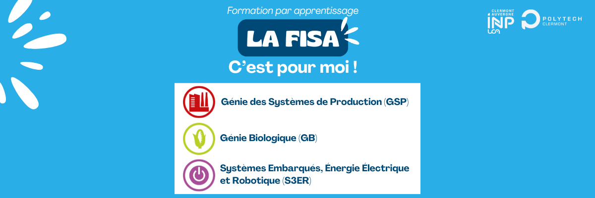 Polytech Clermont forme déjà des ingénieurs en apprentissage dans la spécialité Génie des Systèmes de Production (GSP) et ouvrira dès la rentrée 2026 deux nouvelles filières FISA (Formation Initiale sous Statut d’Apprenti) dans les spécialités Systèmes Embarqués, Énergie Électrique et Robotique (S3ER) et du Génie Biologique (GB), en partenariat avec le CFA Formasup Auvergne.