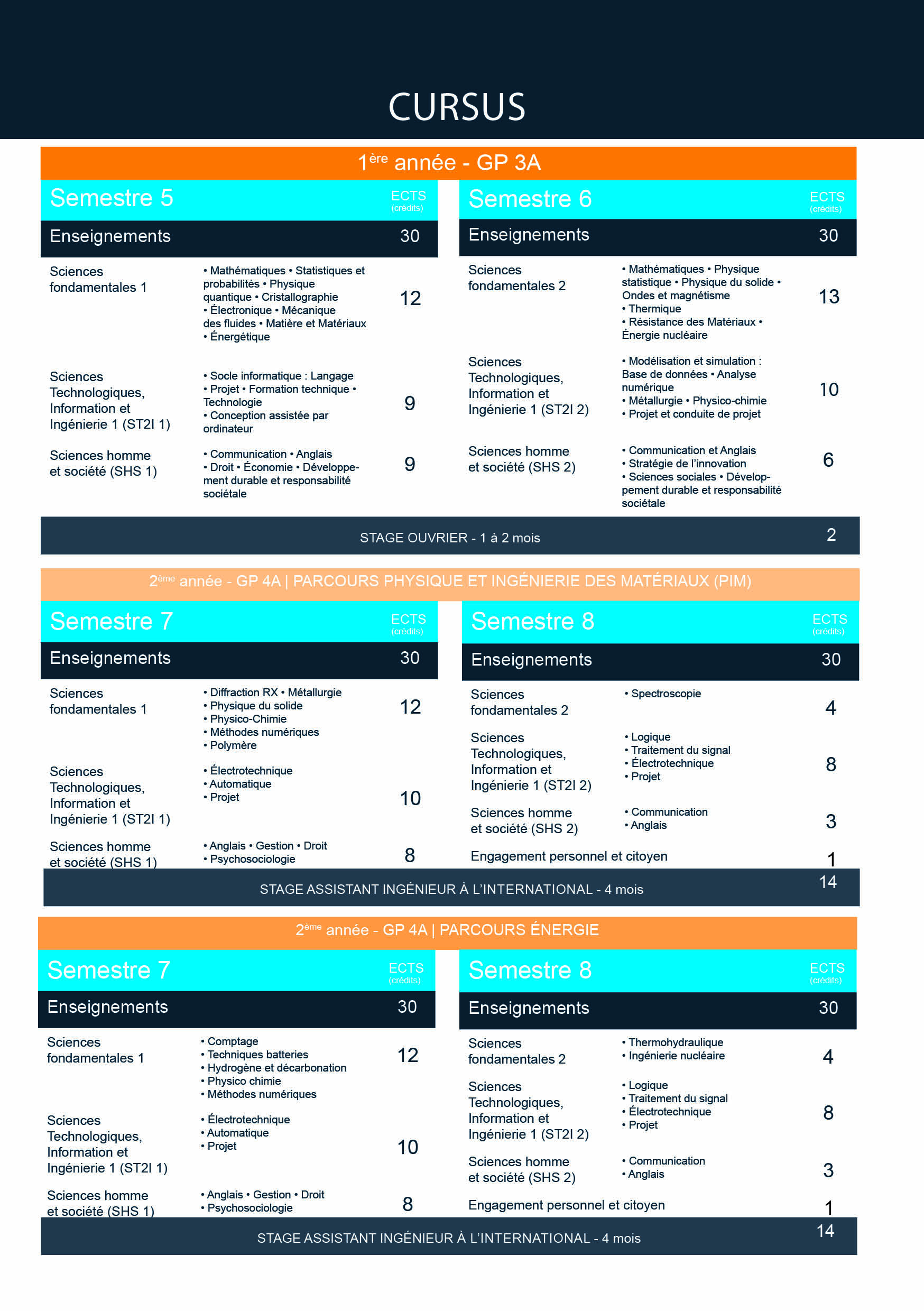 Les informations ci-dessous sont données à titre indicatif et peuvent faire l'objet de mises à jour.A partir de la 4ème année, plusieurs options sont disponibles :